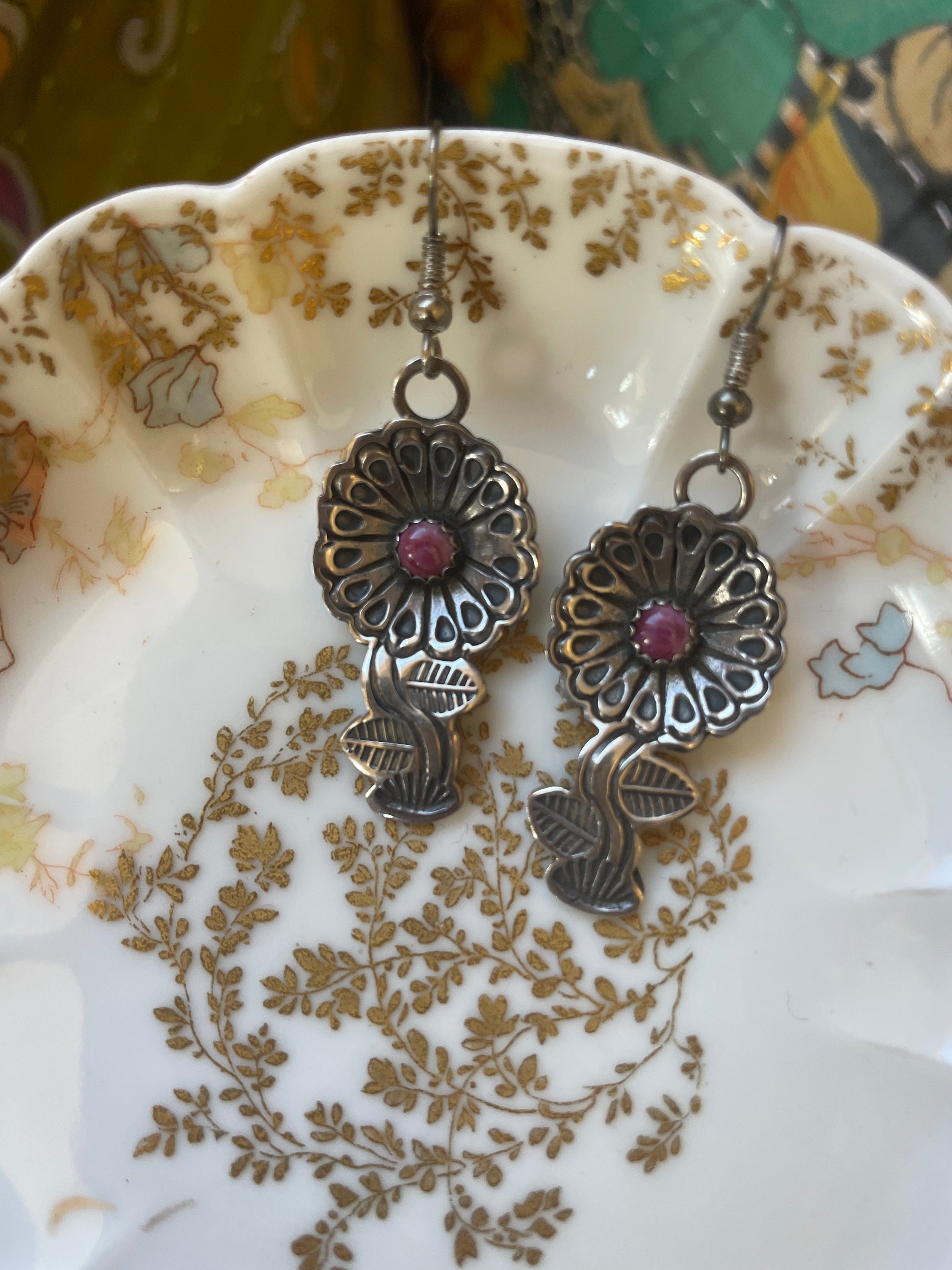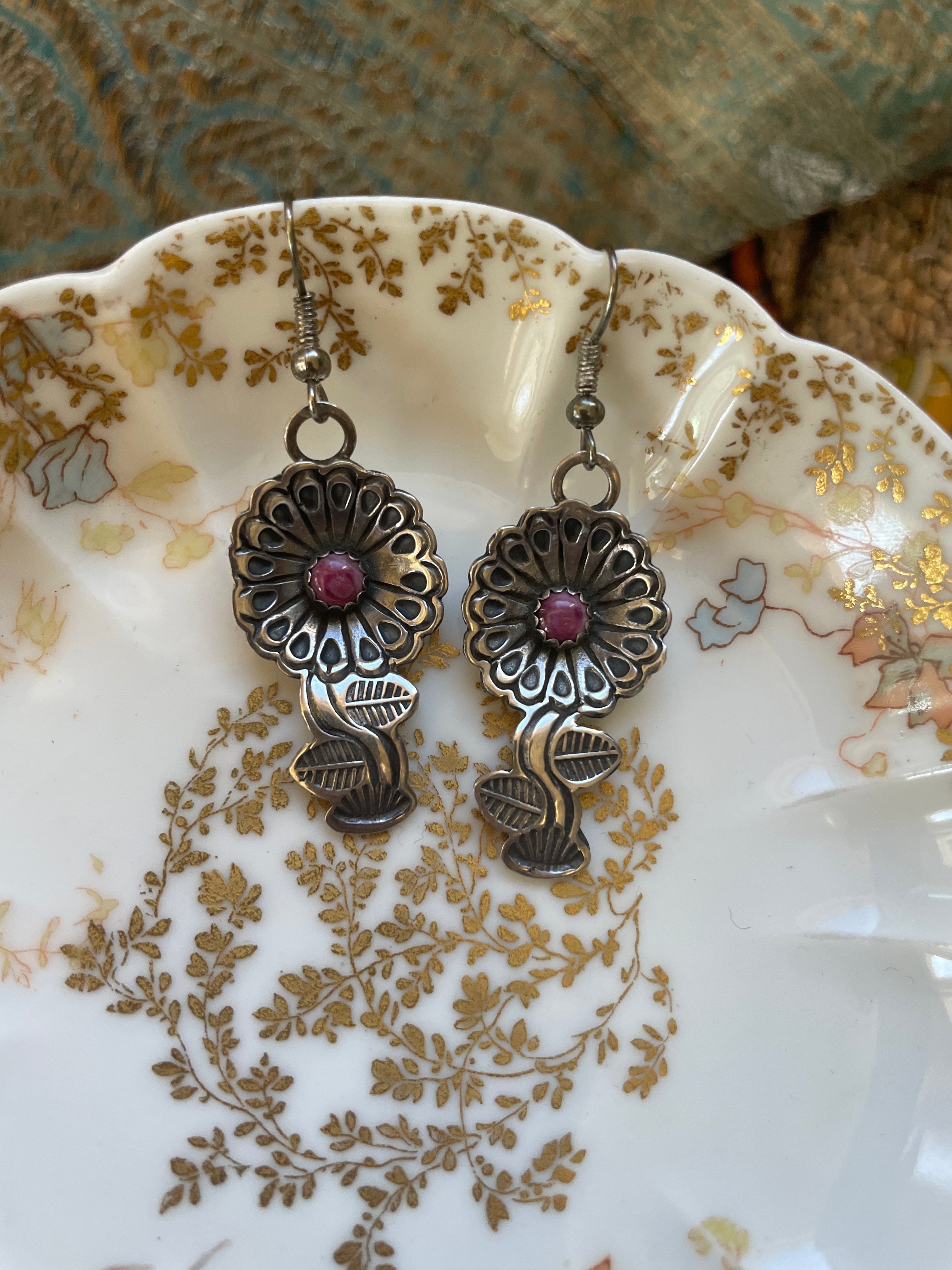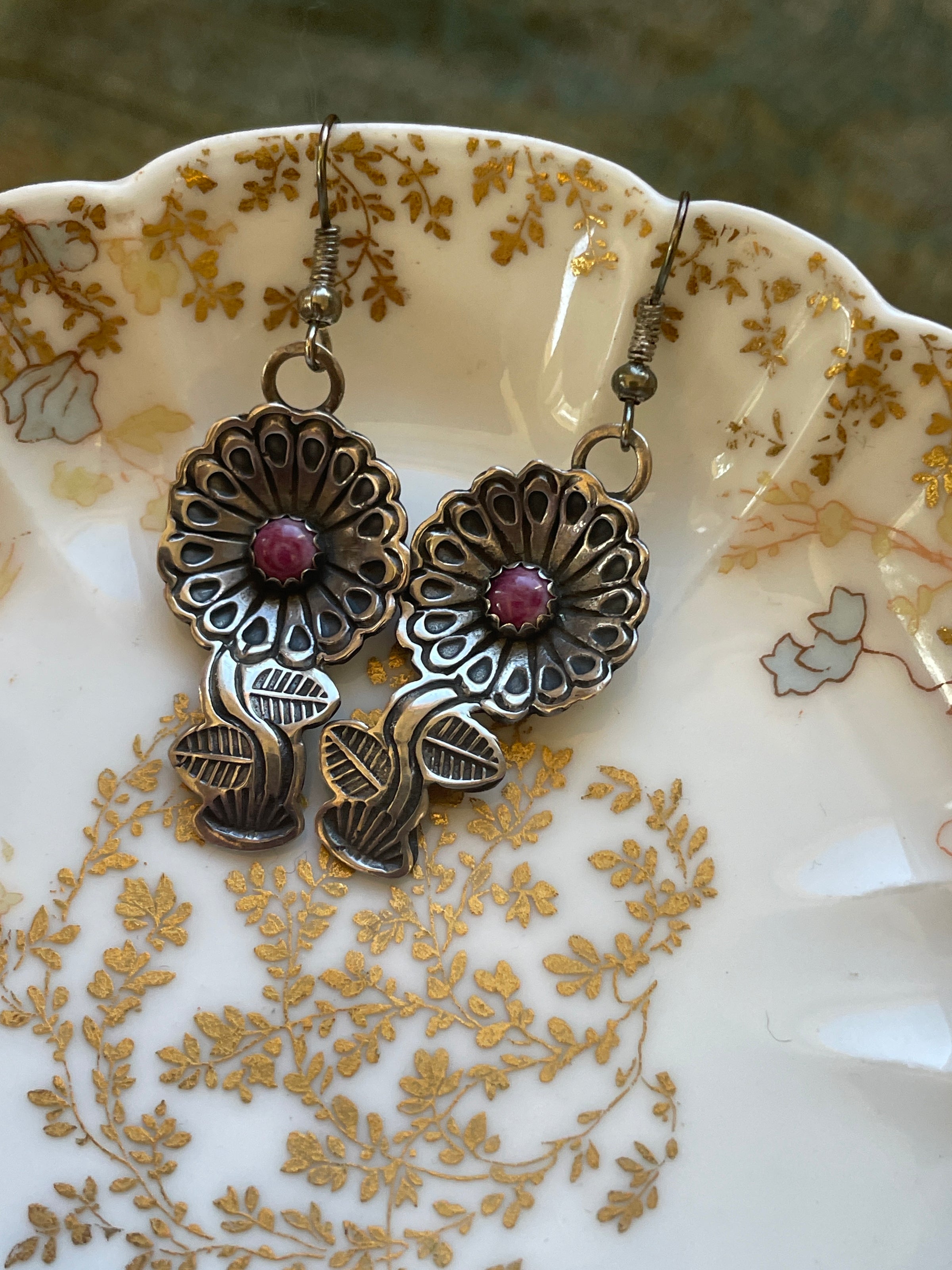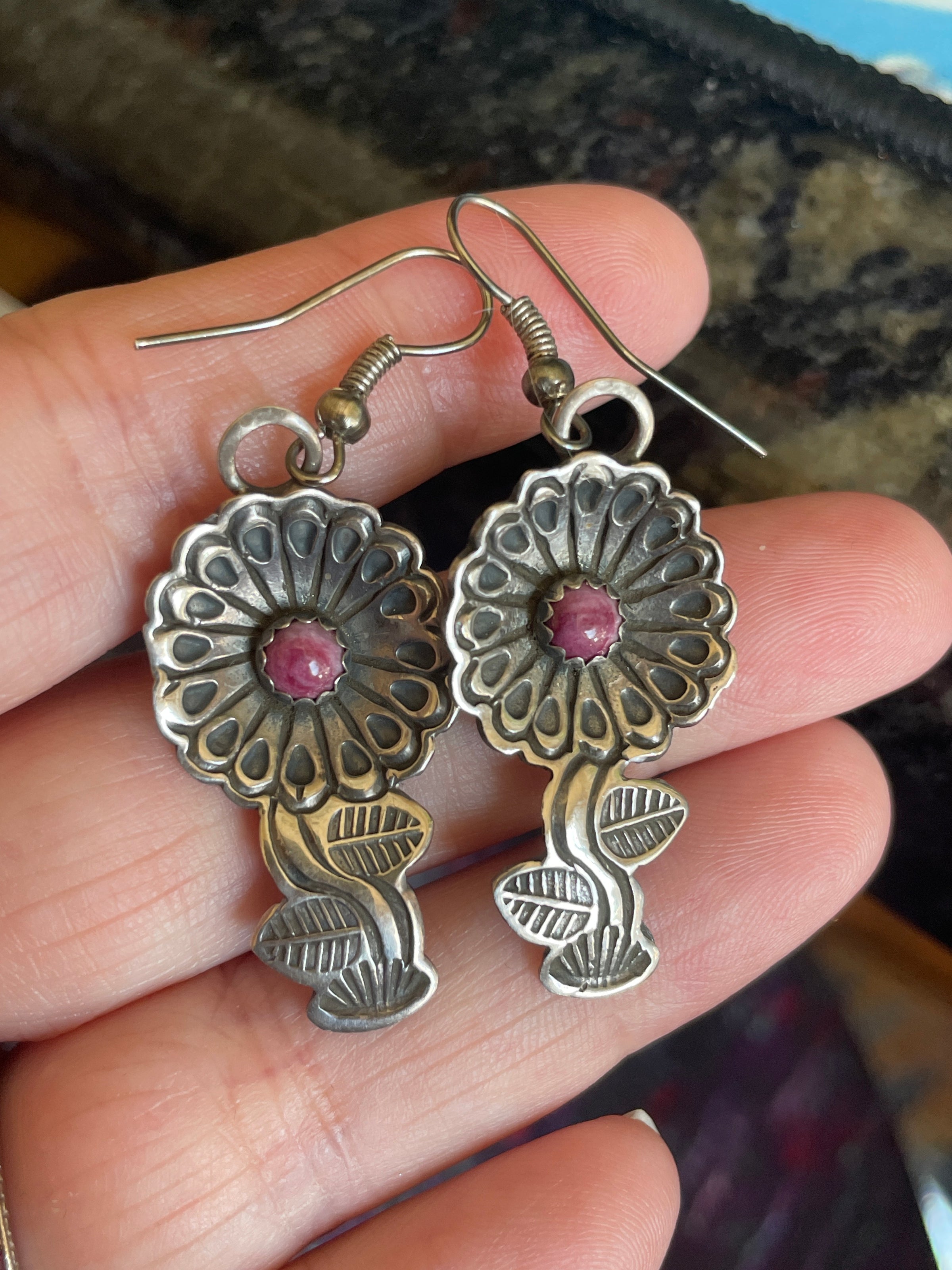 Stunning hand made hand engraved flower earrings with Sugilite centers. These measure approx 1.75 inches. Tested sterling.