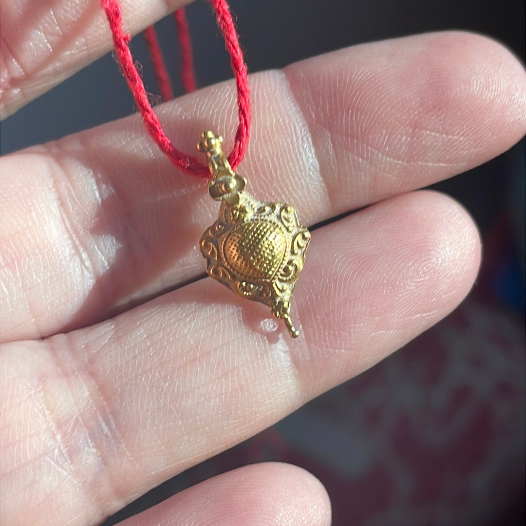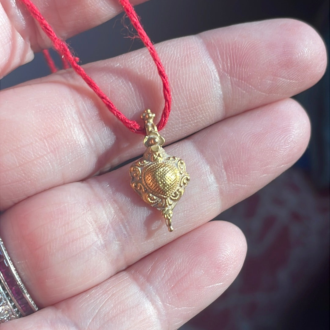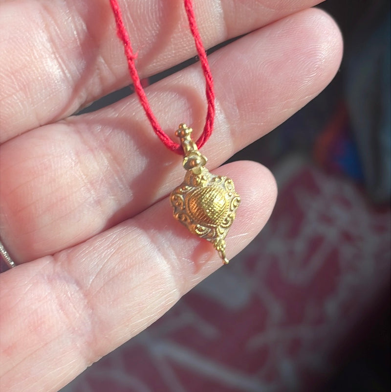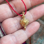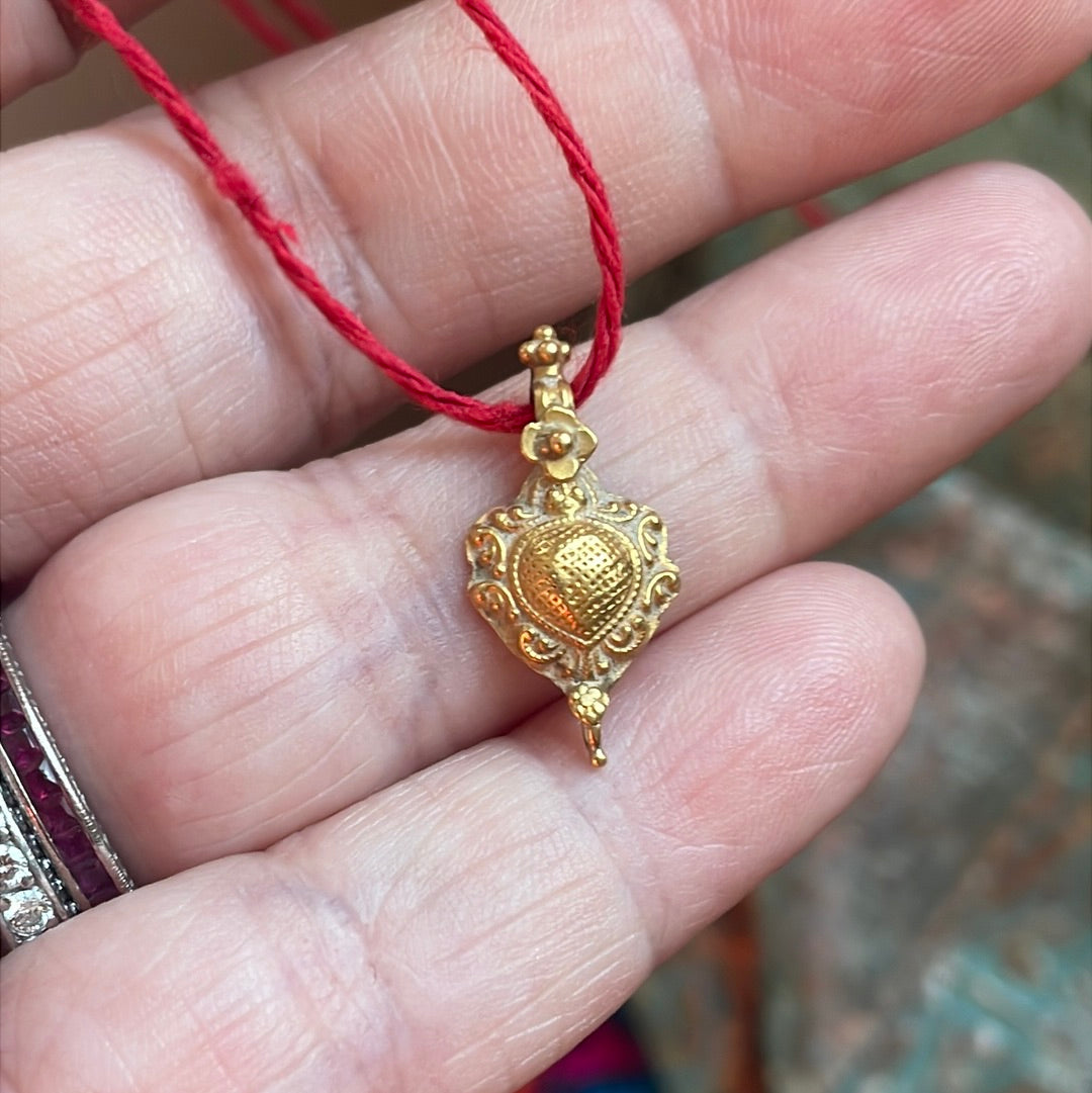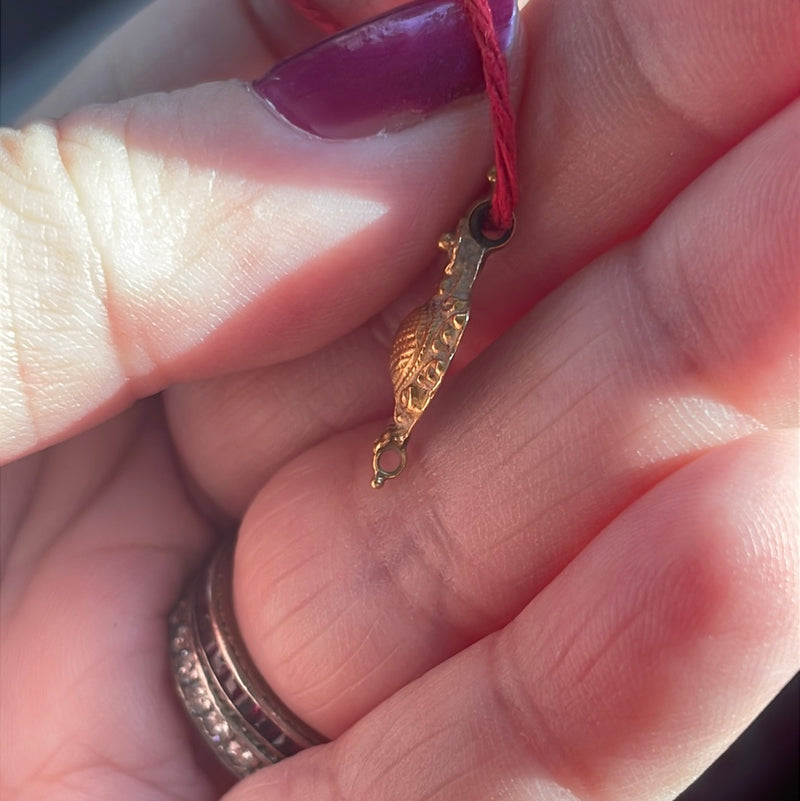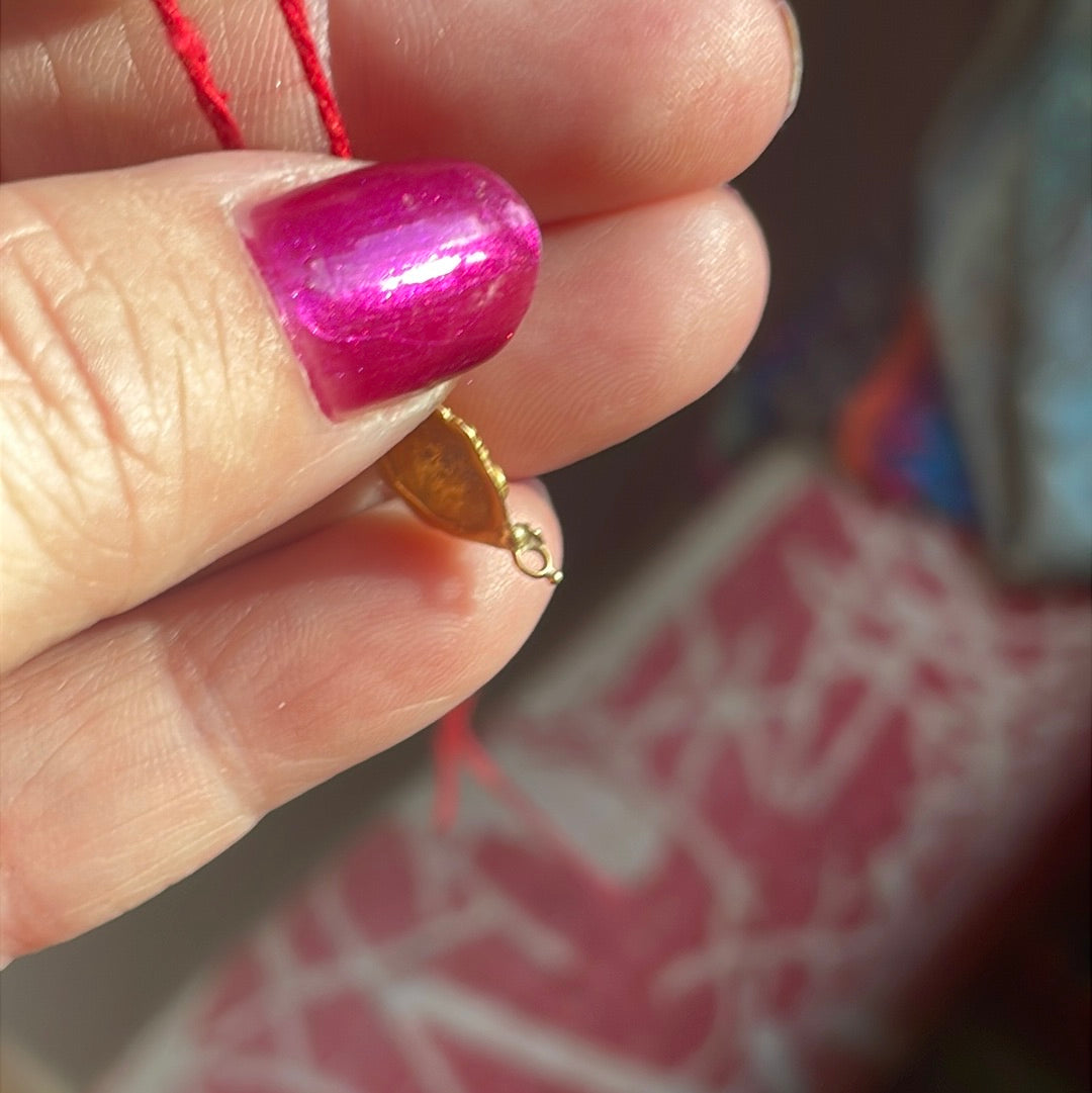 Stunning rare antique drop pendant in 18k gold. Beautiful ornate and dainty. Measures 0.75 inches with top loop. Has a bottom loop as well so can dangle a tiny gem if you wish to. Will be sent on red cord but requires a very fine chain. Opening is less than 1mm. Tested 18k.