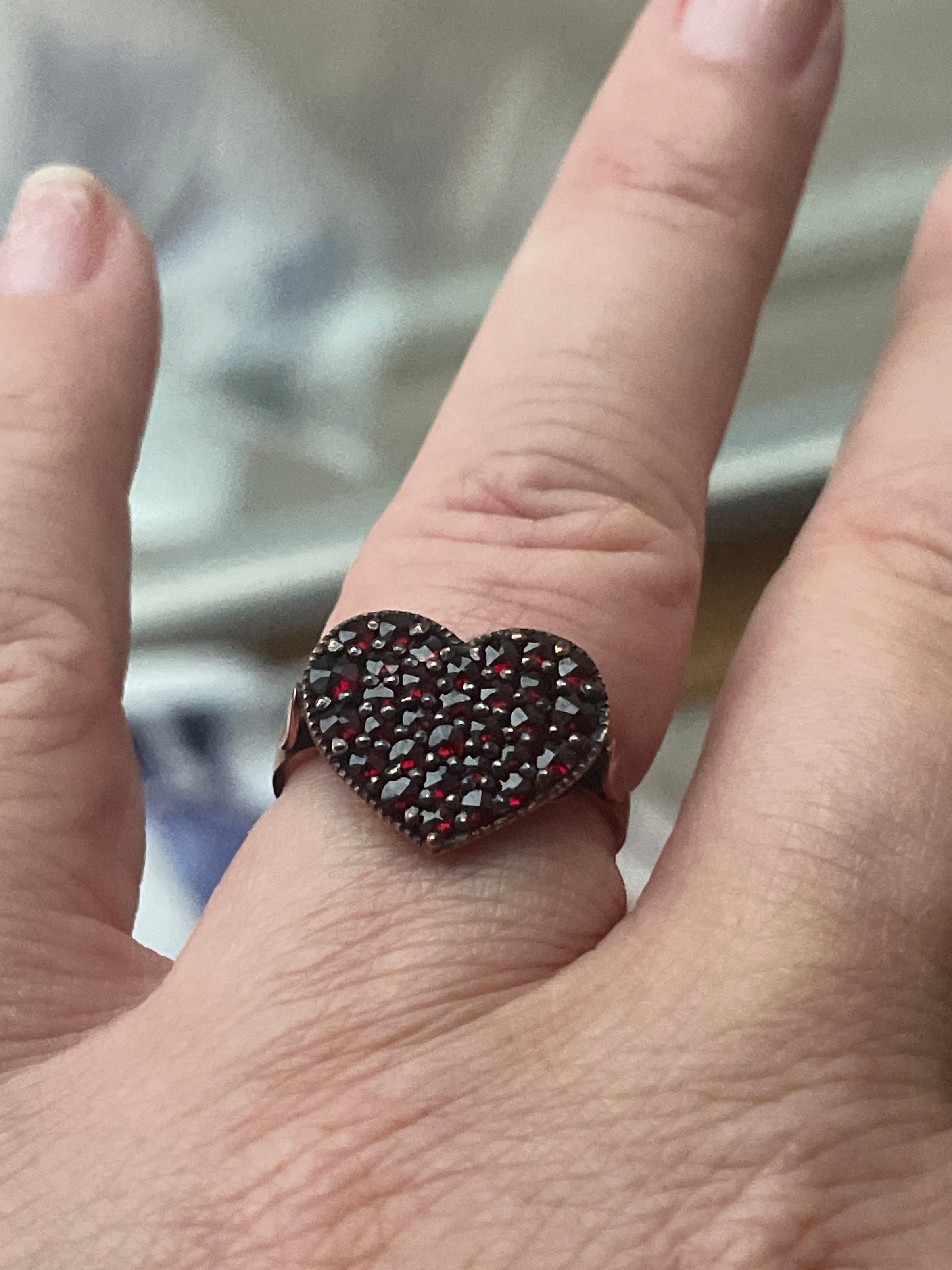 Gorgeous Bohemian Garnet heart ring in sterling silver with Rose gold wash.   Ring size = 6.25.  Stamped 925 and some other marks hard to make out.  Note gold is a very rosy hue.