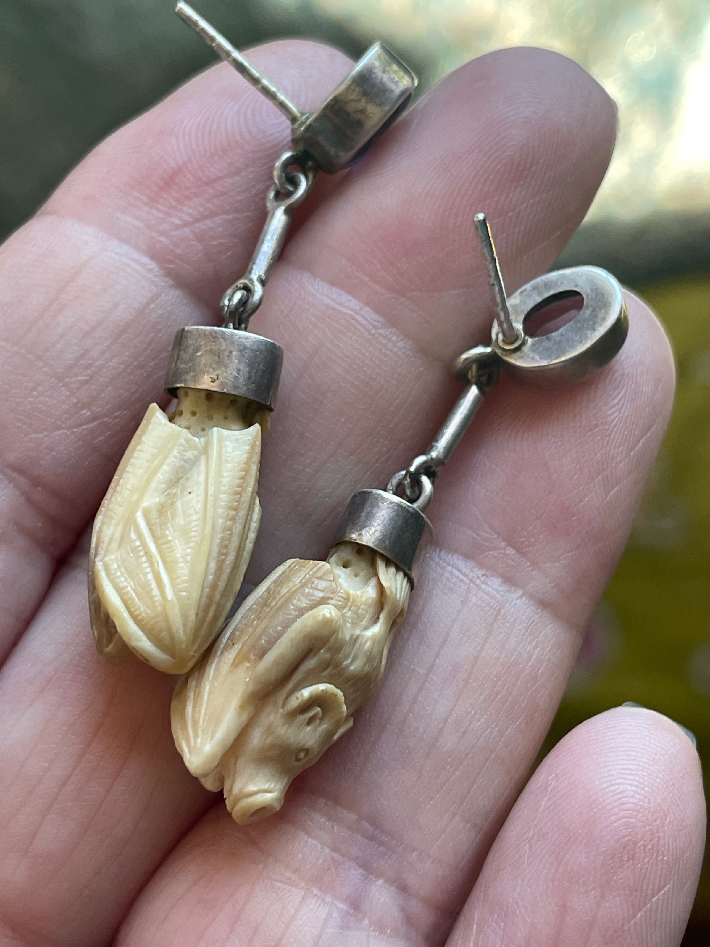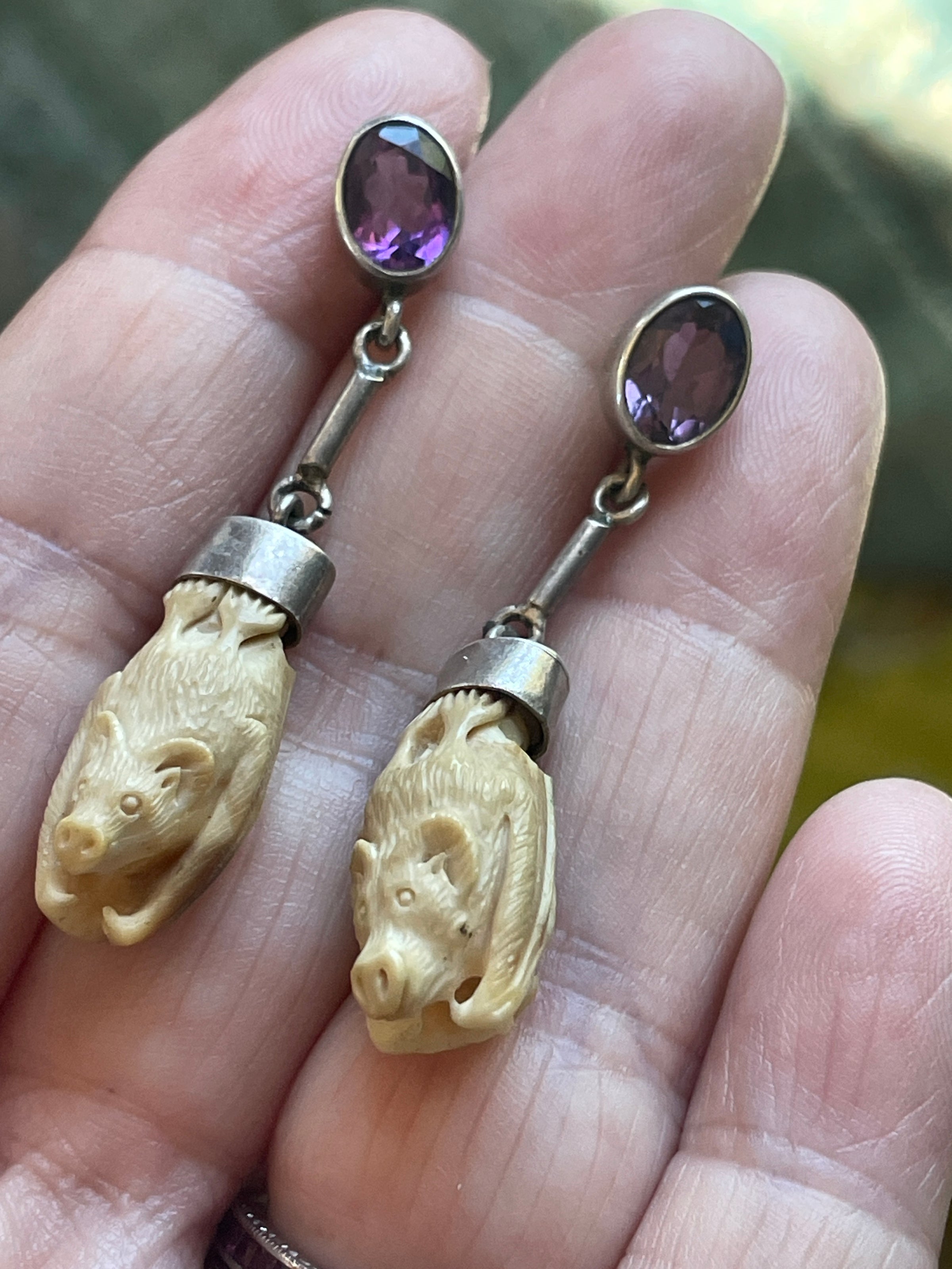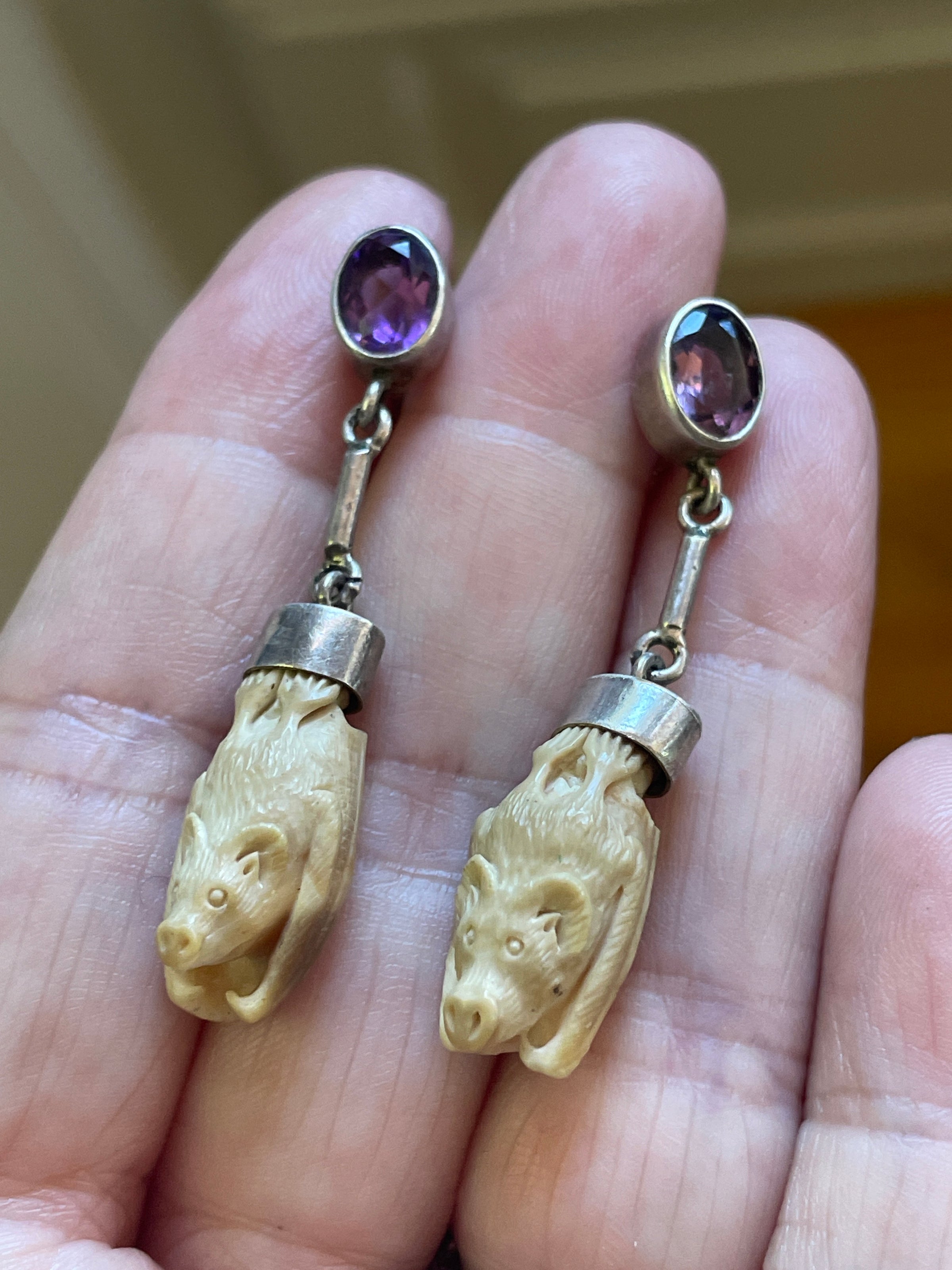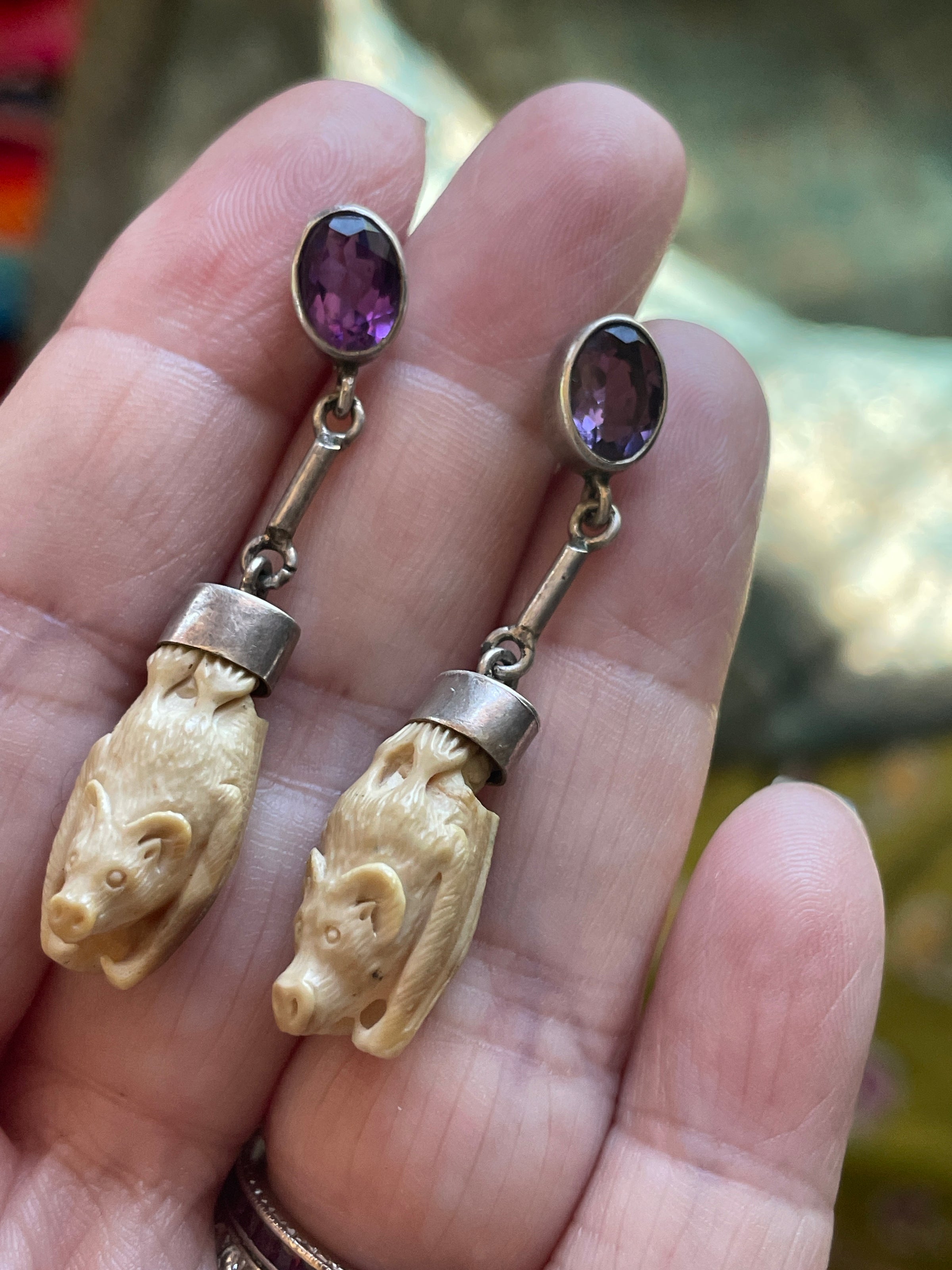 Ultra rare hand carved Bat earrings (made from Cow teeth) suspended from Amethyst topped sterling earrings.  Just under 1.75 inches.  Tested sterling.  They come with plastic backs.