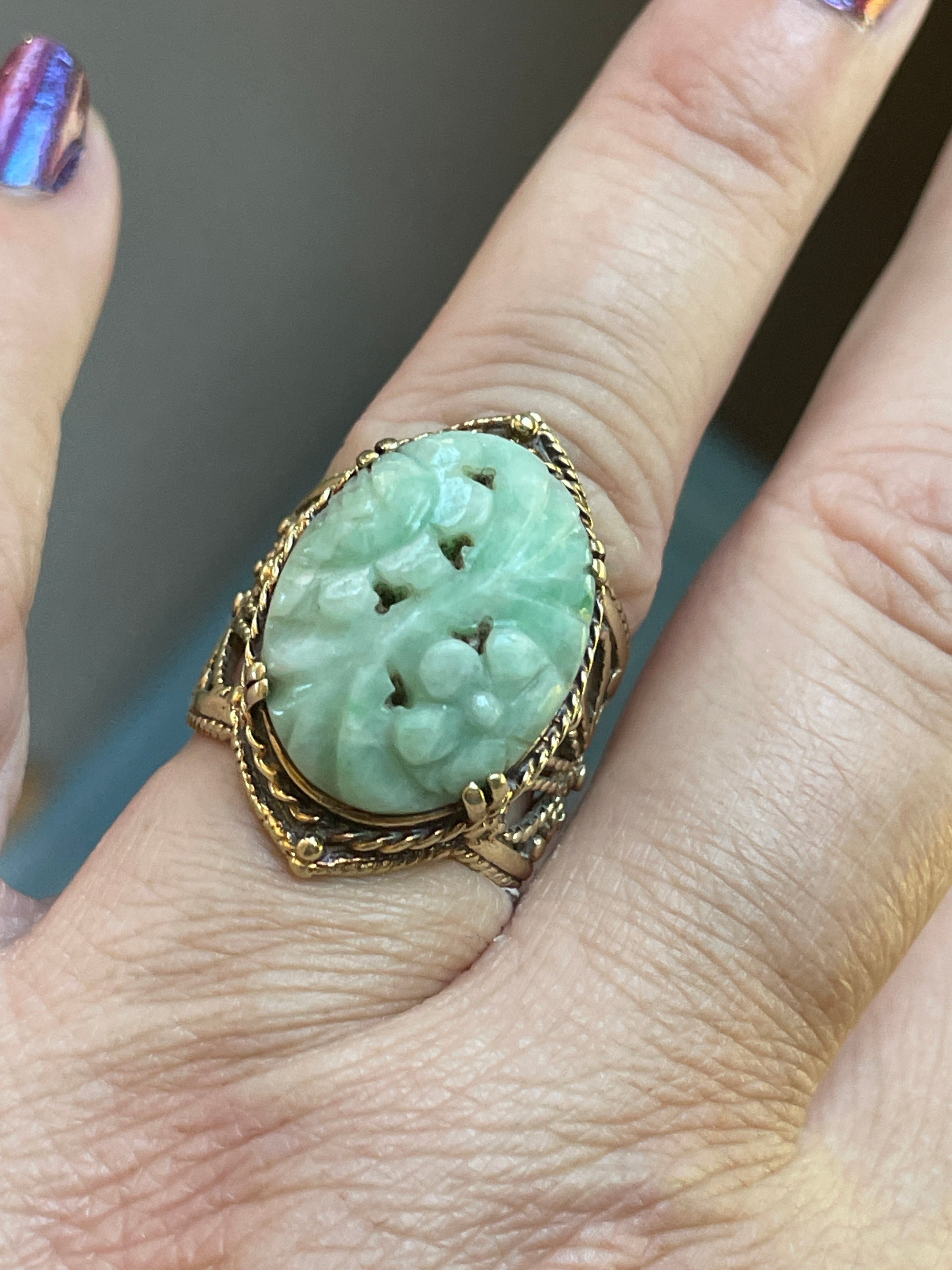 Carved Jade Filigree Ring - 14k Gold - Vintage