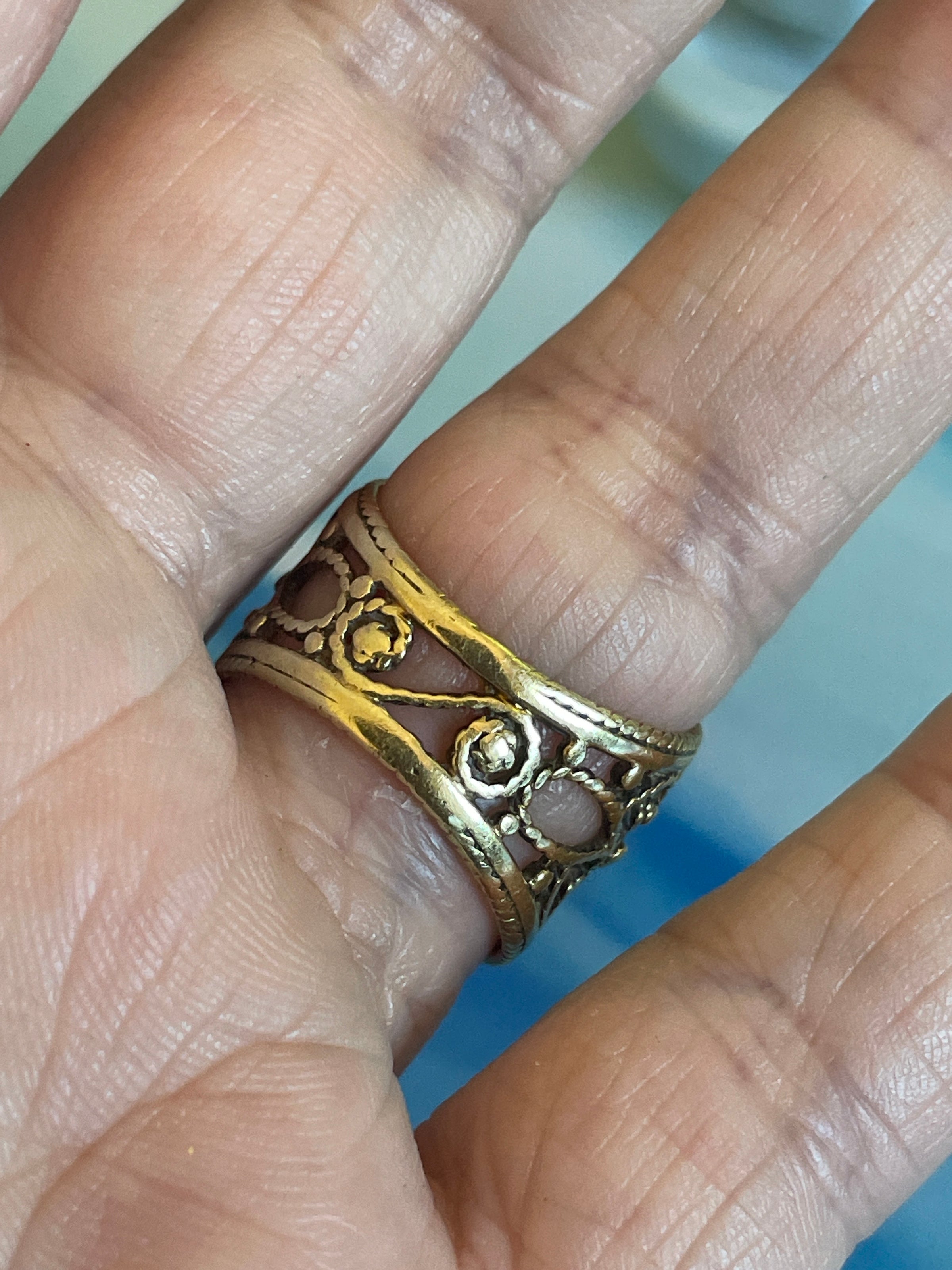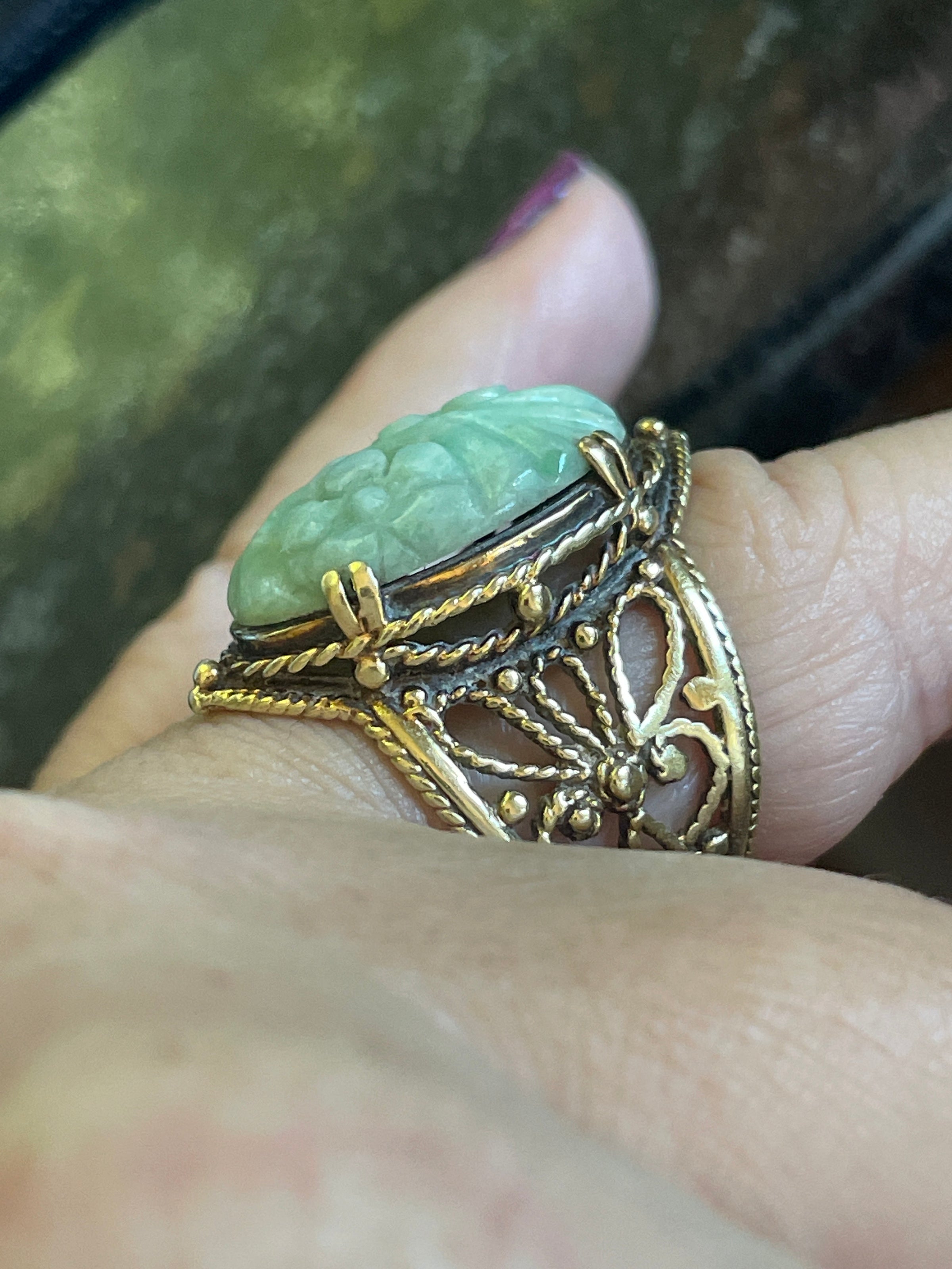 Phenomenal carved Jade ring with ornate filigree setting.  Jade measures 19mm x 15mm.  Size = 7.  Beautiful band would be hard to size.  Tested 14k.