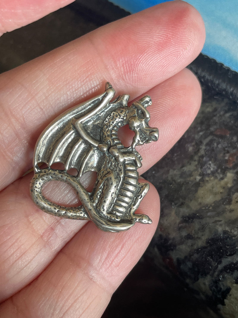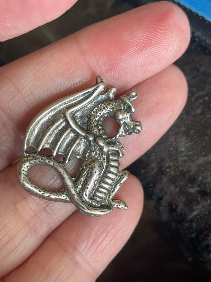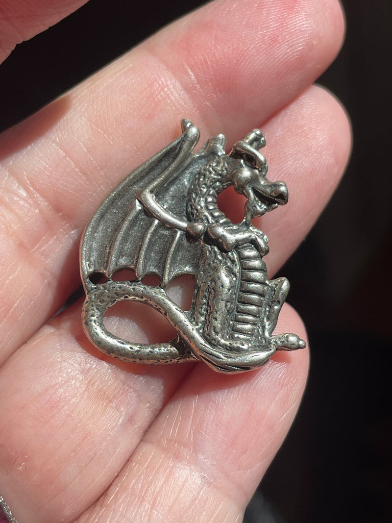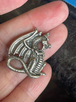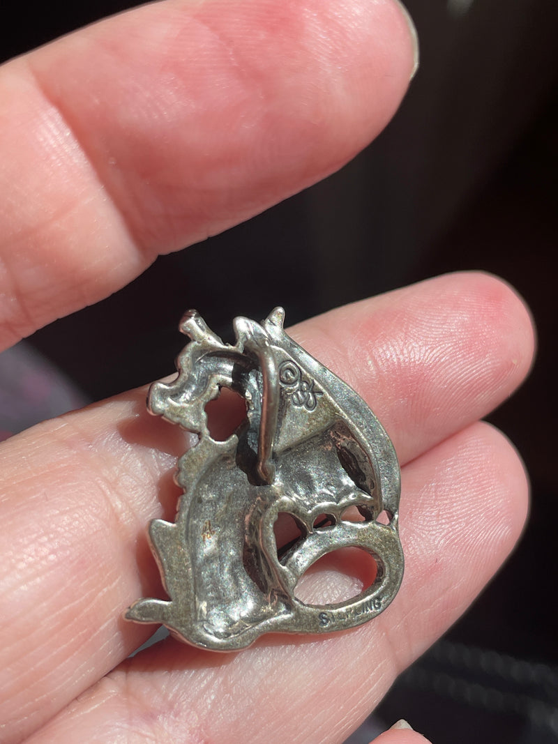 Fabulous Dragon pendant in sterling silver.  Stamped Sterling on back.  Measures approx 1 inch x 1 inch.  Has hidden bail.