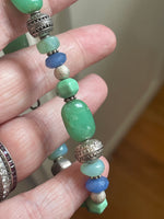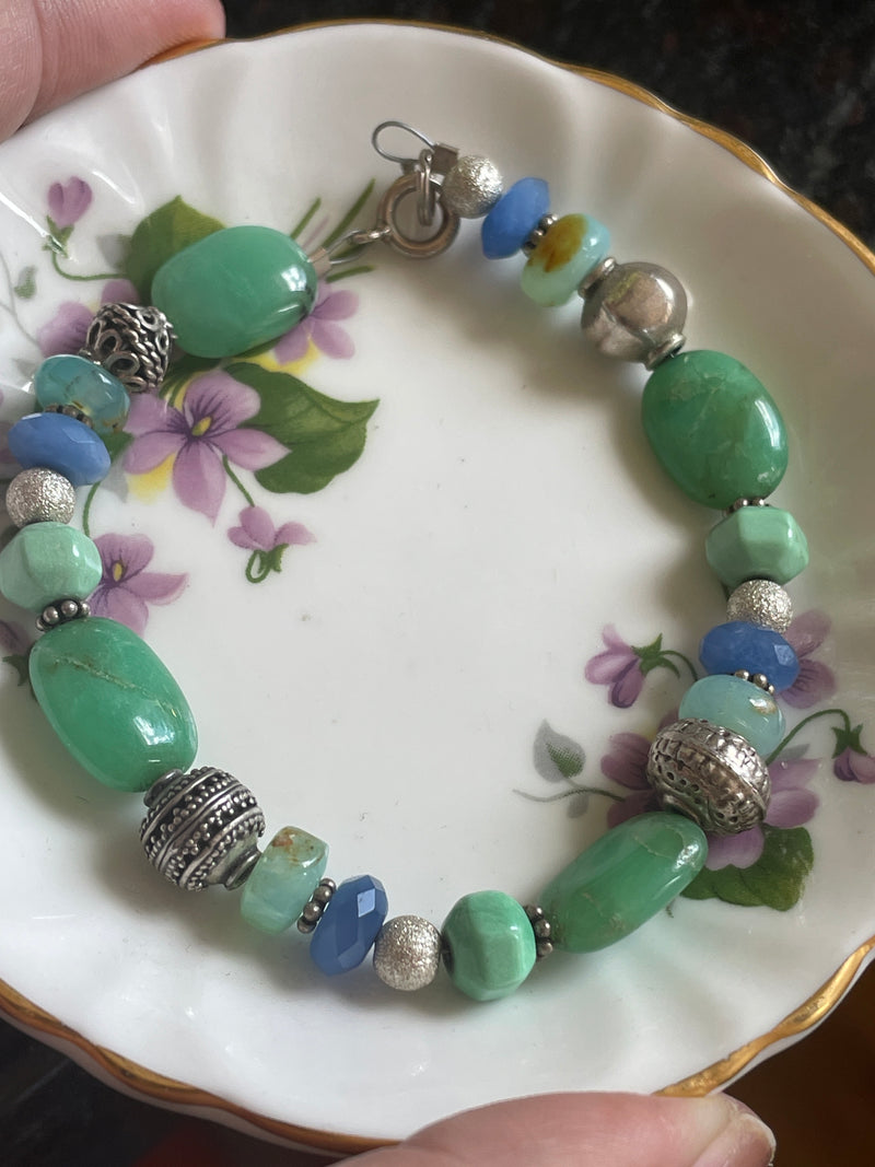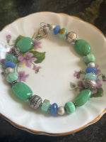 Fabulous gemstone bracelet with Chrysoprase, Chalcedony, Turquoise and Peruvian Opal. All findings and beads are sterling silver. Several of the sterling ornate beads are vintage. Bracelet measures approximately 7.25 inches.