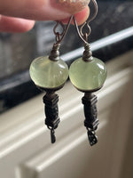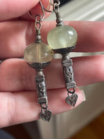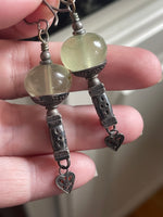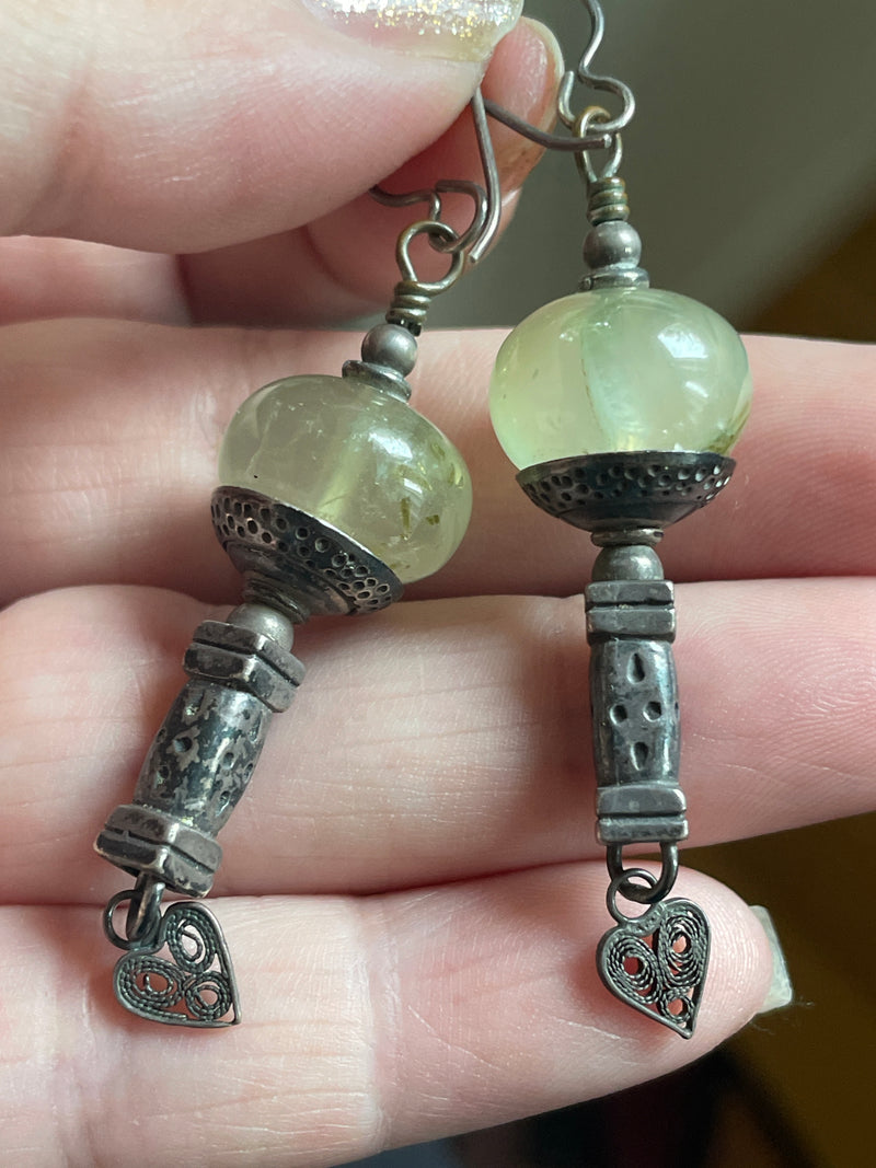 Fabulous likely handmade Jade earrings with ornate engraved sterling findings.  They even have tiny heart filigree drops on the bottom. They measure just over 2 inches with earwires.  Unmarked but tested sterling.