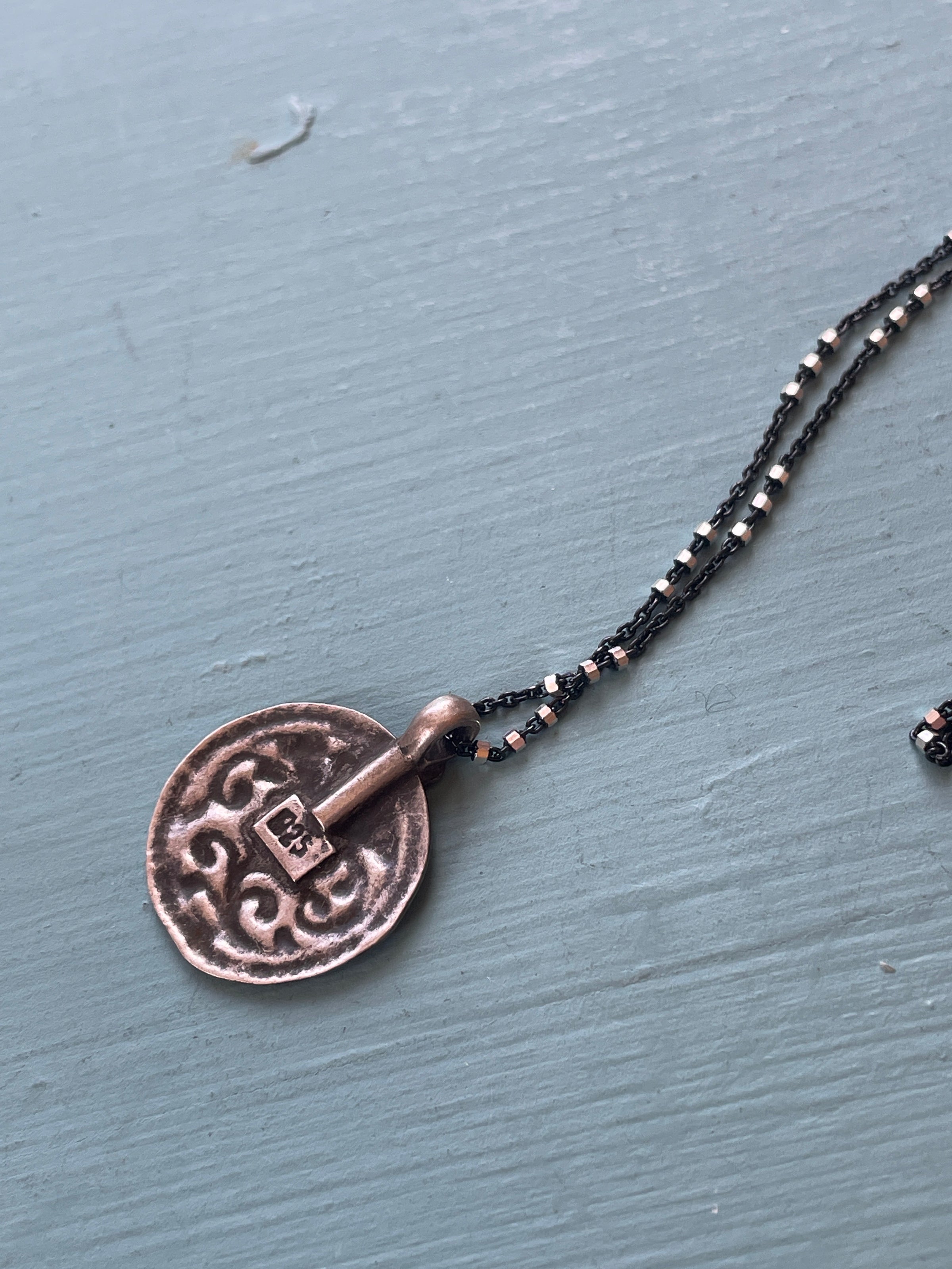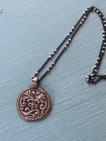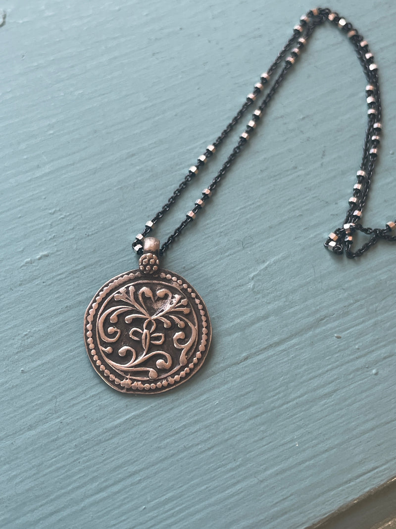 Fabulous vintage Medallion pendant in sterling silver. I bought a collection of these pieces. They are beautifully made. Pendant measures just over 0.75 inches (with top flower bail). Chain is modern with a darkened oxidized background and a satellite design with shiny beads in groups of three. Chain measures 18 inches.