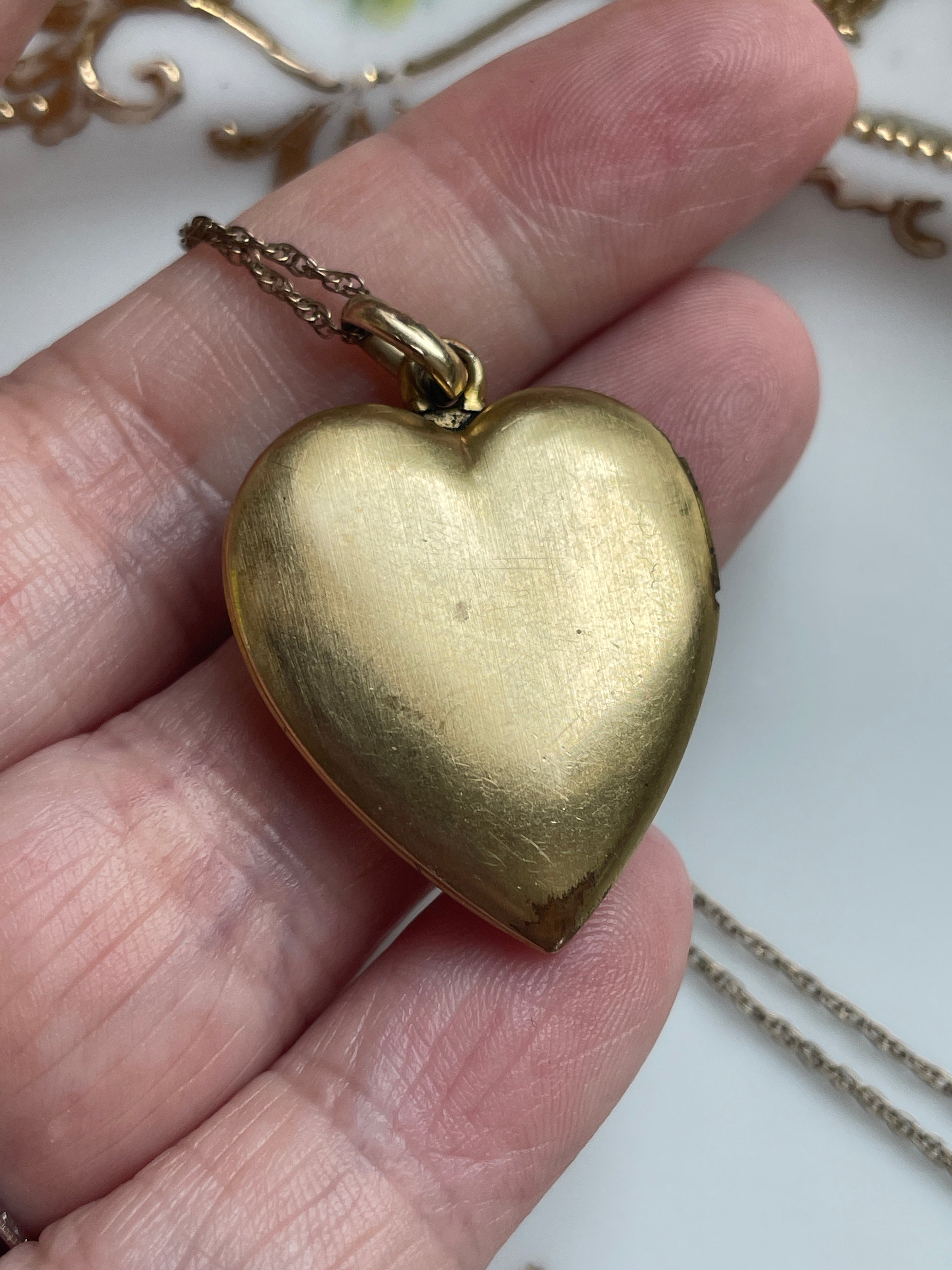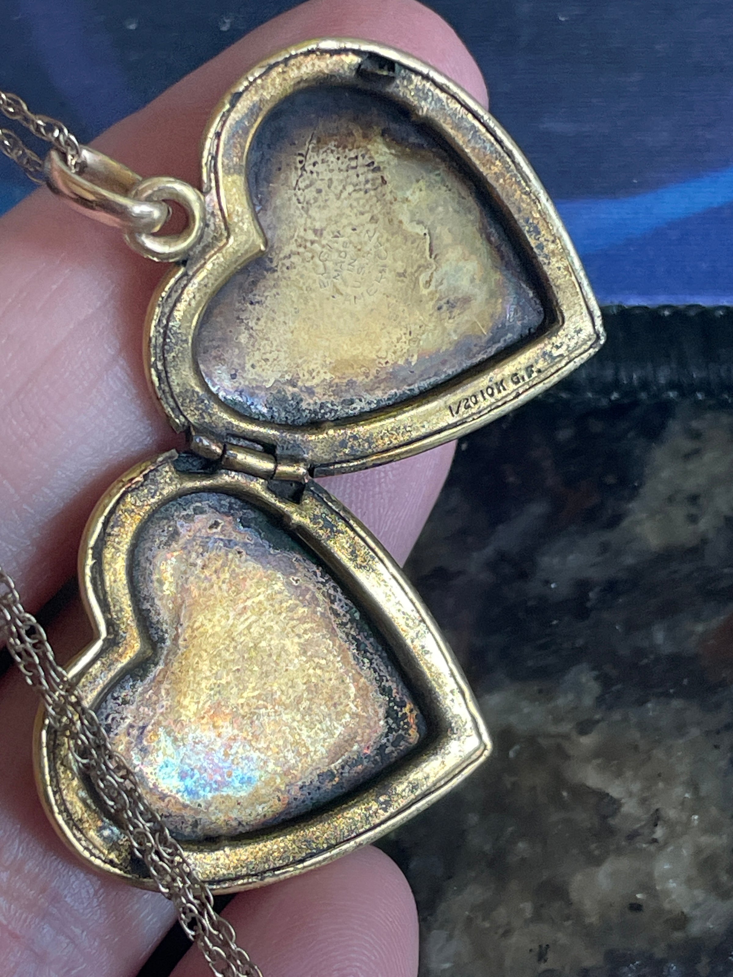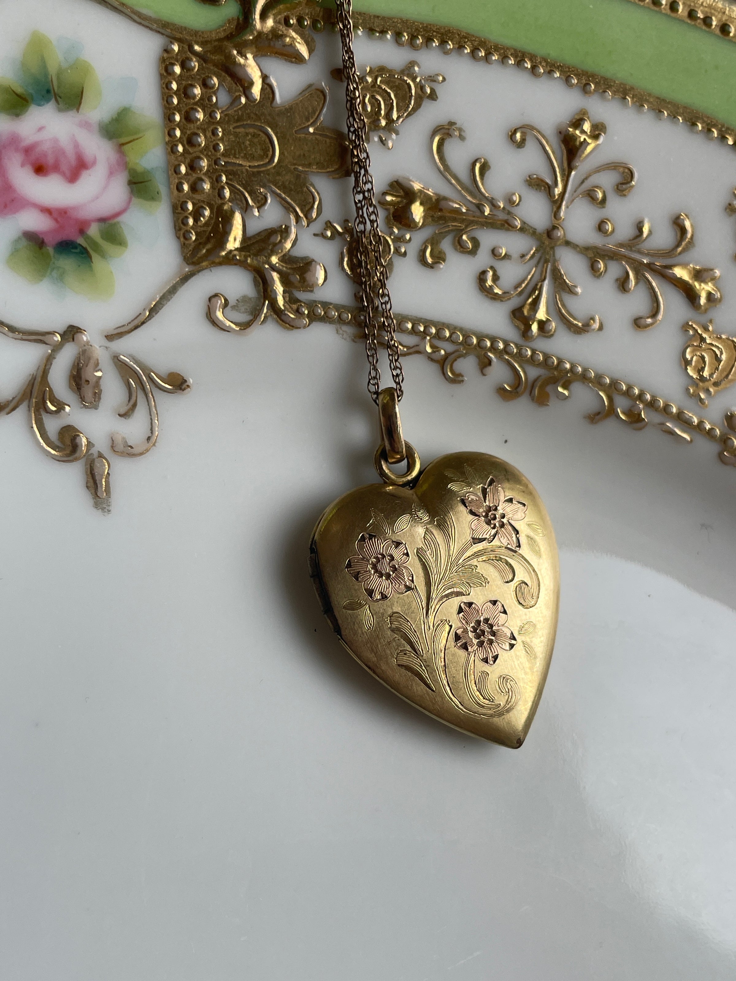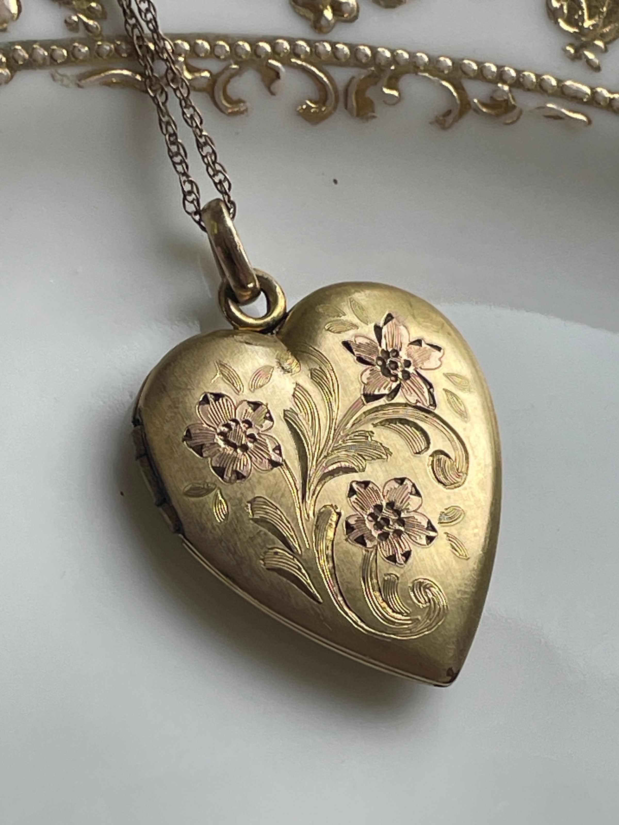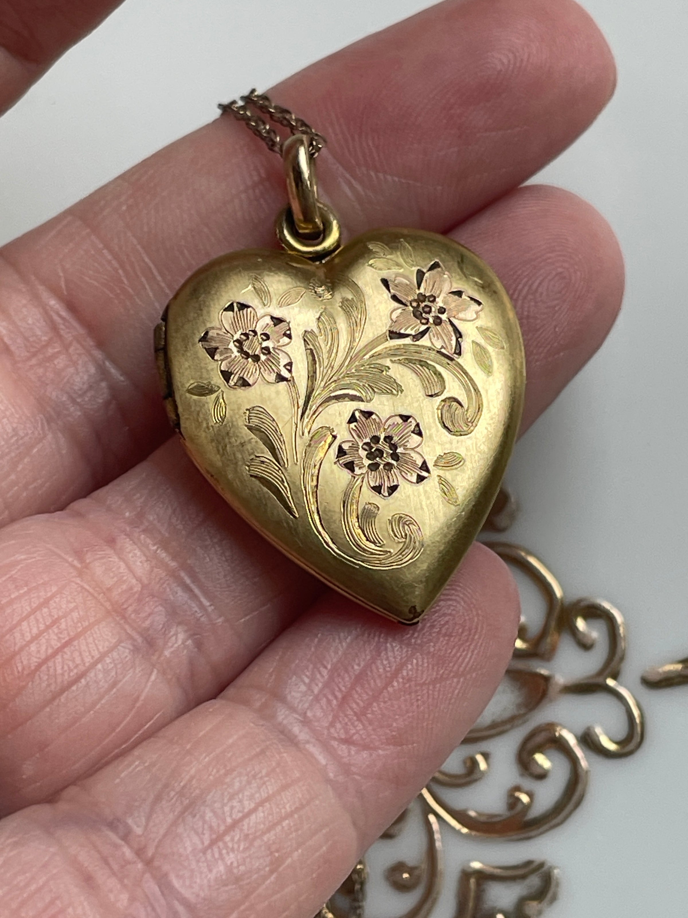 Gorgeous Rose gold floral trilogy locket with beautiful design. Has ornately carved flowers in Rose Gold and leaves engraved in the subtle yellow gold background. Locket measures 1.25 inches with loop x just over 0.75 inches. Inside could use a good cleaning. Stamped “1/20 12k GF” for gold filled. Closes but doesn’t snap shut. Comes on an 18 inch gold filled rope chain stamped 1/20 14k GF on clasp.