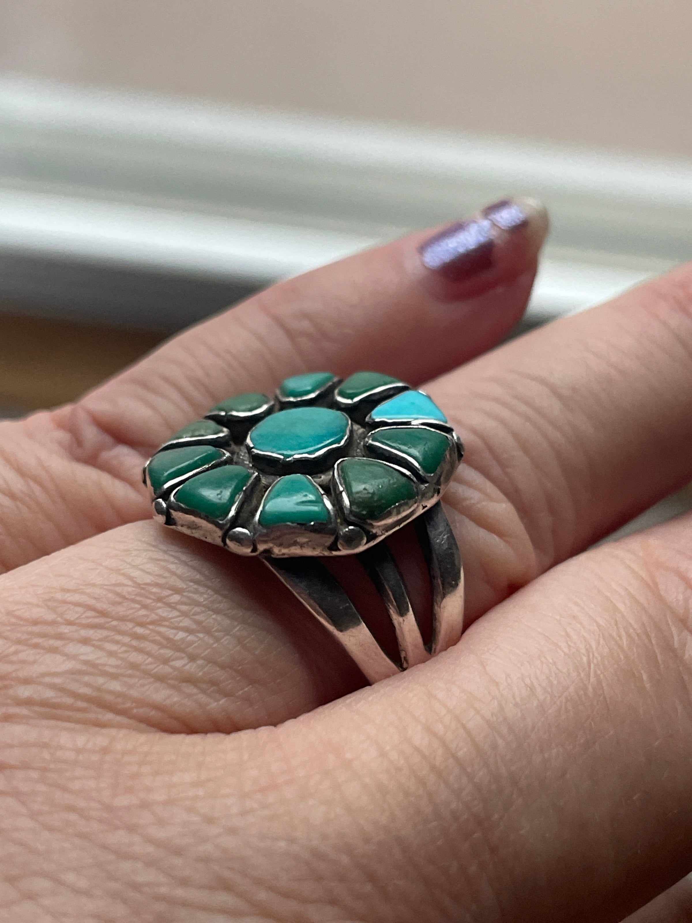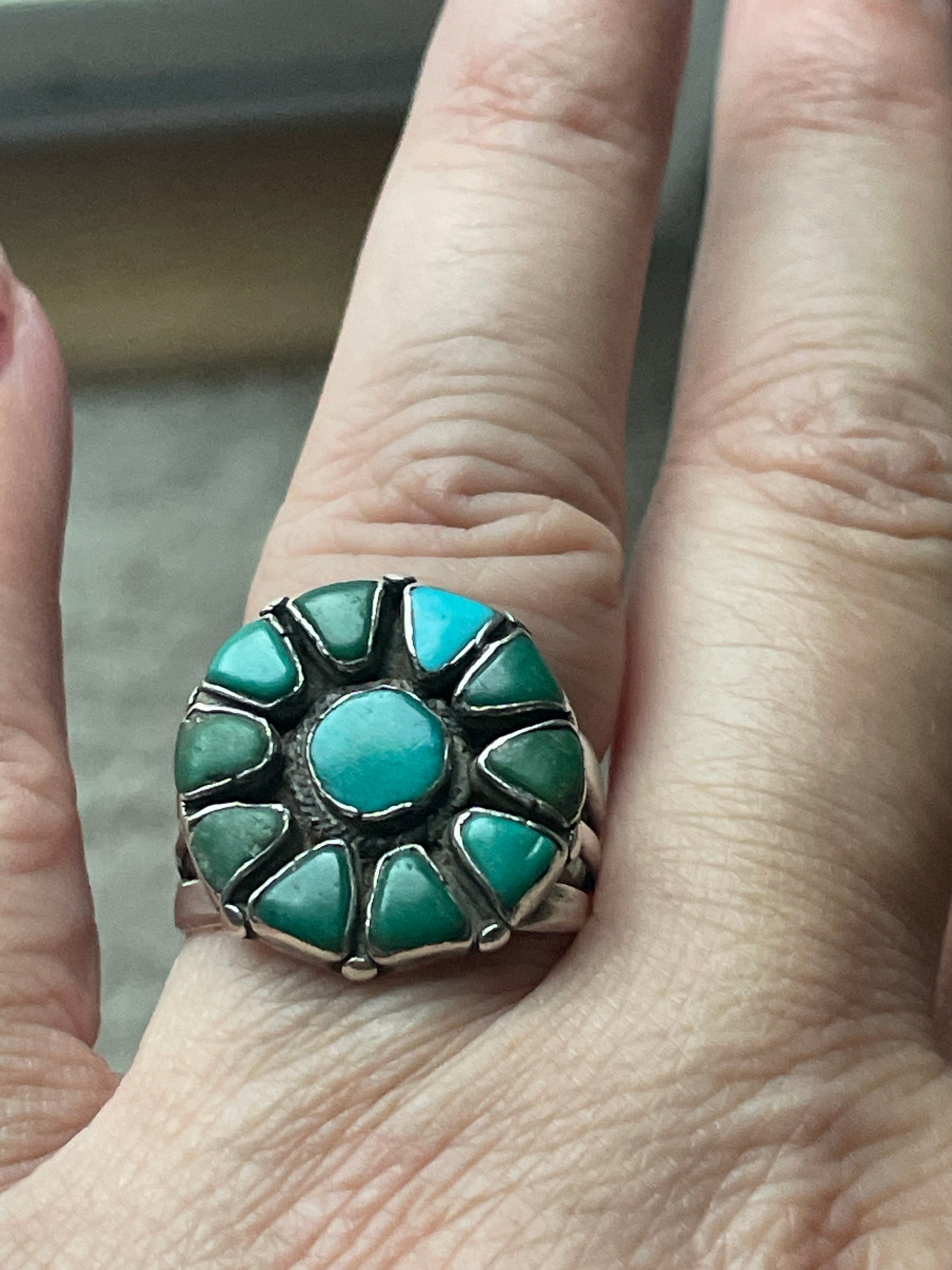 Gorgeous Native American Turquoise flower ring in sterling silver. Ring size = 8.25. Tested sterling.