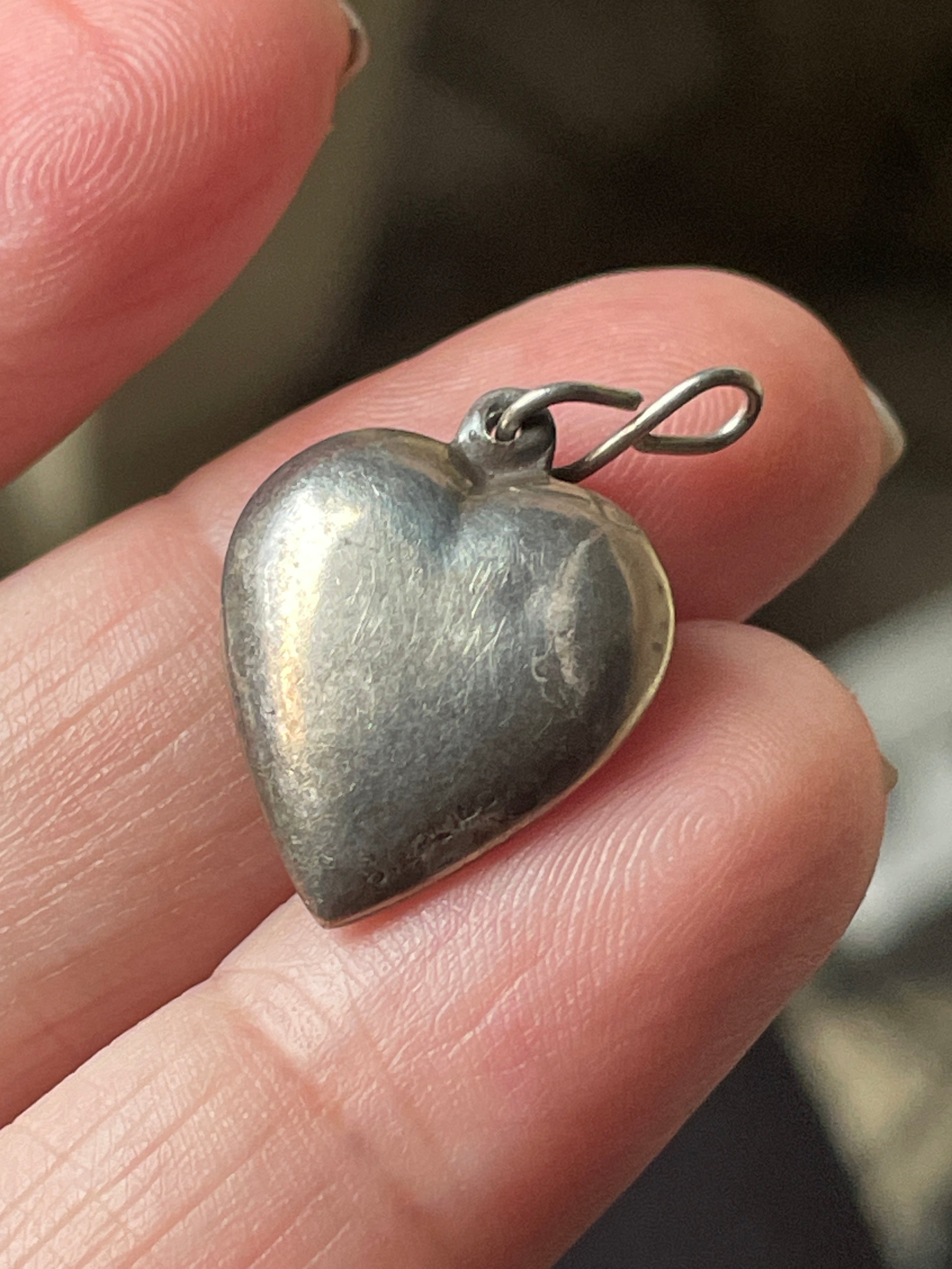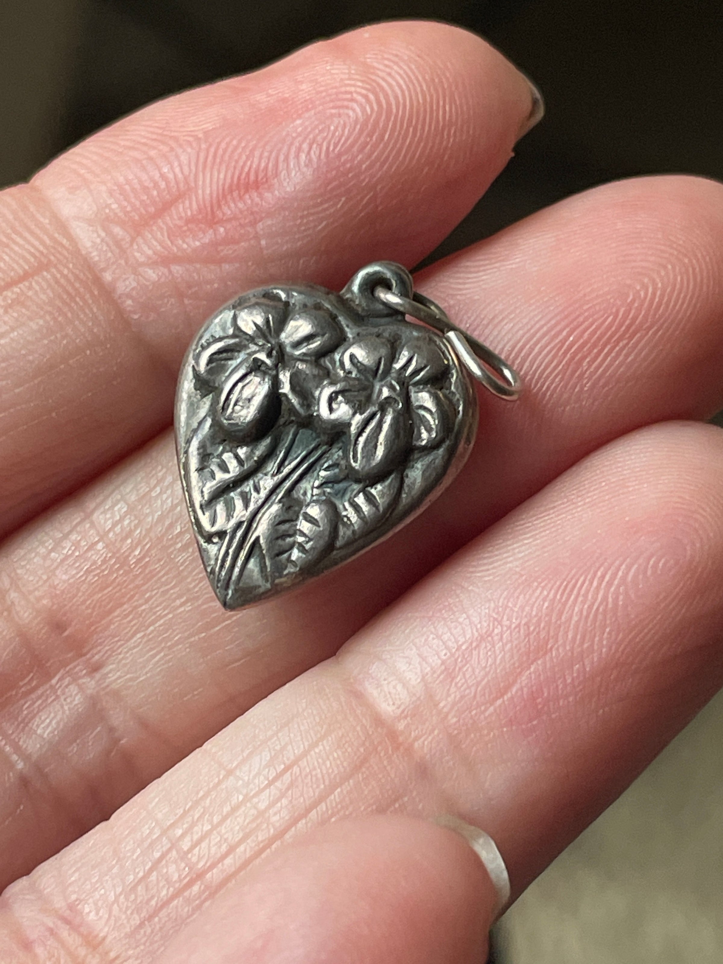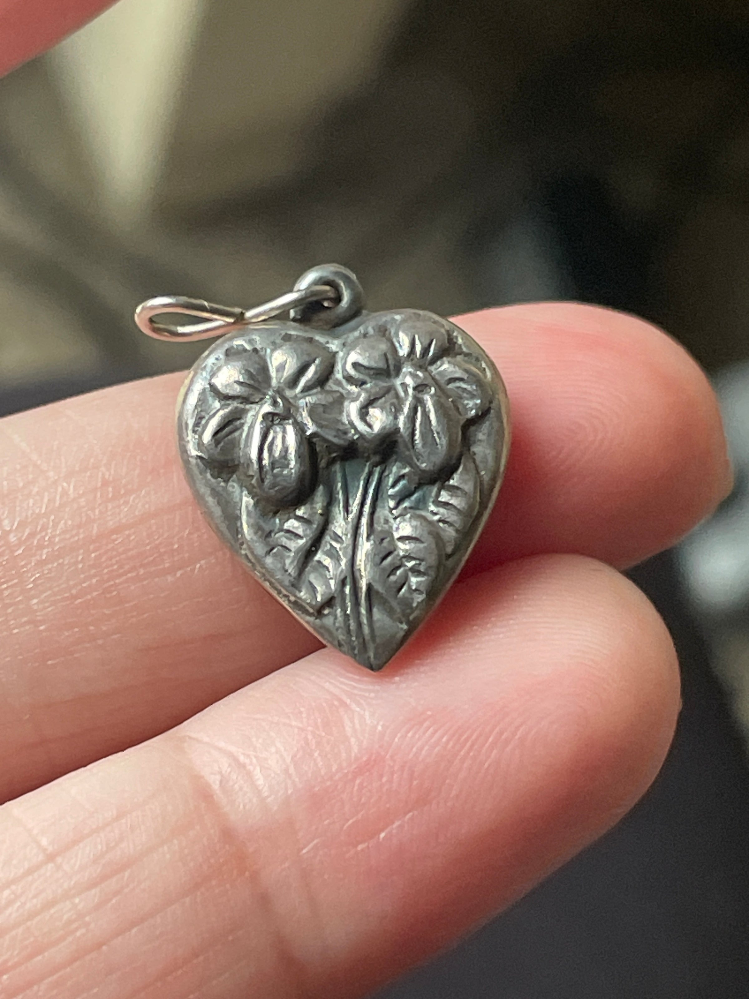 Stunning Victorian flower heart pendant in sterling silver.  Has raised floral design.  Measures just over 0.5 inches.  Stamped Sterling.  Has little ding on back.  Note loop at top is like a figure 8 I would recommend changing to a single loop.